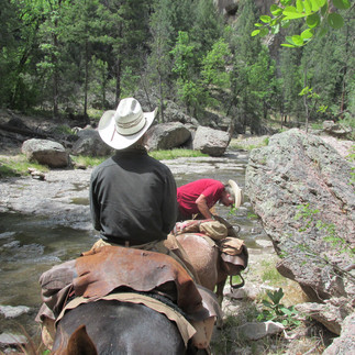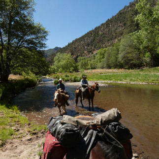 The horses are behaving very well. Their urge to hide and run away has turned into an eagerness to be with us and move on. The only problems we have are that they don't like to be led. Except for Kiowa. We camp outside every night, with just a sleeping bag and mat. We cook on a gas stove as fires are not allowed. It's never been this dry in the last 35 years and we might have trouble finding grass further north. We descend from Tad Pool Lake and reach Sheep Creek Corall, where we fill up with fresh water and reach the Gila River around 2 pm. After three river crossings, we set up camp and take a refreshing dip in the river.
