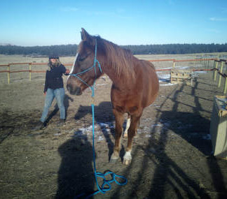 Since Wednesday, the 3rd in the group is now at the ranch. Deets, he is a BLM mustang from California, who was kept in the Canon City prison here in Colorado and tamed by inmates of the prison. On Thursday, Melly arrived to take over the training of the three horses. The three horses have different characters. Deets is friendly, easily distracted but willing to learn, has already been ridden but is still a little timid. Rodeo is rather suspicious, dominant, but attentive and eager to work, has already been ridden, but is not enthusiastic about it and wants to leave under saddle. He comes from the Equine Sanctuary, a horse rescue center near Castle Rock. He was captured from the wild in Kentucky and broken in at the sanctuary for the 2nd time. He must have been under saddle before he was captured. Ahi is intelligent, but shy of work and people. Ahi lived the first 6 years of his life in a pasture south of Buenos Aires at Estancia El Cardal, then was in training for 14 days before I brought him to Atlanta in January, where he stood in a pasture until he arrived in Colorado. The three horses are in a pasture with direct access to the paddock and stable. They are still confined to the paddock at night, but in a day or two they will have free access to the pasture 24 hours a day.