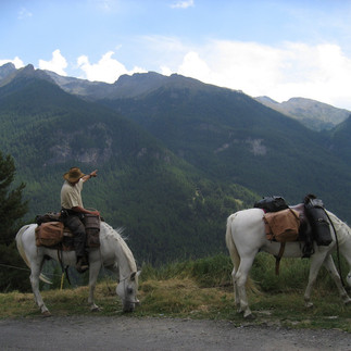 Wir erhielten zwei Gänge vom Buffet, extra Sandwiches für den nächsten Tag und die Thermos gefüllt mit Kaffee. Der Tag verspricht schön zu werden, deshalb nehmen wir den Aufstieg zum 2800 m hoch gelegenen Pass erfrischt und gut erholt in Angriff. Die Pferde ziehen uns in gewohnter Manier den Berg, wie mobile Skilifte, hinauf, wo uns eine grandiose Aussicht auf den Monte Viso erwartet. Heute hat ausnahmsweise Pat eine Kolik und es geht ihr nicht so gut, wie sonst. Sie trinkt einen Likör, redet von heisser Milch mit Honig und unverhofft tauchen Wanderer auf, die uns Tee anbieten. Gott ist gut. Die Koliken der Pferde führe ich auf Herbstzeitlose zurück, die noch nicht erblüht, von den Pferden gefressen wurden. Denn später fanden wir die Wiesen voll erblühter Herbstzeitloser. Das ganze Gebiet Val Maira ist wunderschön, und während ich dies schreibe, machen wir unsere Mittagsrast in 2000 m Höhe. Die Pferde grasen frei auf 2 Hektar Weide und wir geniessen die Aussicht und unser Prosciutto, Pomodoro, Fromaggio Sandwich. Wir führen die Pferde auf einem gut ausgebautem Wanderweg wieder auf 1000 m hinab und kommen nach Bellino, als es wieder zuzieht und der Nebel die Berge einhüllt. Wir erreichen Castelfino und kaufen ein. Vollbepackt mit Lebensmittel für die nächsten Tage, reiten wir entlang dem Stausee nach Maddalena hoch, wo die Dame vom Posta Tapa mehr Sorge, um die Sauberkeit Ihrer Einfahrt, als Interresse uns Unterkunft zu gewähren, hat. Sie verweisst uns auf ihre Nachbarin, die auch Pferde habe. Die etwas reservierte Wirtin taut dann soweit auf, als sie unsere Pferde sieht, dass wir Weide, Strom, Wasser und Heu bekommen. Nach Kraftfutter werde ich nach der Dusche ihren Gatten fragen. Der ist vielleicht etwas weniger gestresst.