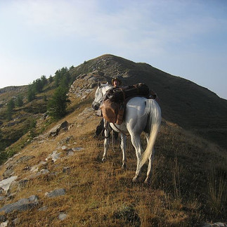 Da wir von der Staubstrasse des Vortages genug hatten, entschieden wir uns, wieder auf den Kamm hochzugehen. Der Aufstieg gleich hinter unserem Rastplatz schien machbar, so stiegen wir einfach über den Grassteig nach oben. Nachdem den Pferden klar wurde, wohin es ging, stiegen sie weitgehend selbständig hinauf, ich benutze Domingo zum Teil als Zugtier, und um Flash die Richtung geben zu können. Pat kletterte hinterher. Flash holte sich eine Schramme durch einen runterfallenden Stein, aber ansonsten konnten wir echt stolz sein, auf unsere beiden Araber. Etwa 300 HM höher folgten wir dem Kammweg, den die Soldaten Napoleons gebaut hatten. Der Weg etwa 2m breit erlaubte die Sicht in beide Täler. Am Passo Rosso gingen wir zur Staubstrasse zurück, da nach dem Rosso eine Steinlawine den Durchgang zu verhindern schien. Ein lokaler Bauer zeigte uns jedoch wie weiter kämen. Die Schotterpiste führte uns zum Rif Barbera, dem zweiten von 6 Rifs, das wirklich geöffnet hatte. Pat bestellte ein Tomatensalat, der Wirt winkte lachend ab.
