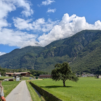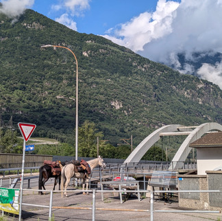 Die beiden sind echt Klasse coole Socken und es war Spass sie dabei zu haben. Wir sind heute nach dem Auffrischen der Ausrüstung (danke Christine) um 12 Uhr mit meinen beiden Arabern Arkan und Mansu losgezogen und Gudrun begleitet mich die nächsten 2 Wochen. Wir haben fast 1000km.hinter uns und etwa 28000 hm trotz Schnee hinter uns gebracht. Heute gings auf dem Fahrradweg dem Fluss entlang und da es sehr heiss war 28 Grad liessen wir keine Bar aus unterwegs. Kurz vor dem Ziel in Villa-Dossola wurde uns von einer Frau Wasser für die Pferde und Obst angeboten. Wir nahmen dankend an und führten dann die Pferde ein paar Strassen weiter zum Pferdehof Pretoria wo wir absattelte; die Pferde duschten und versorgten und dann selbst gegrilltes Huhn und Bier einverleibten.